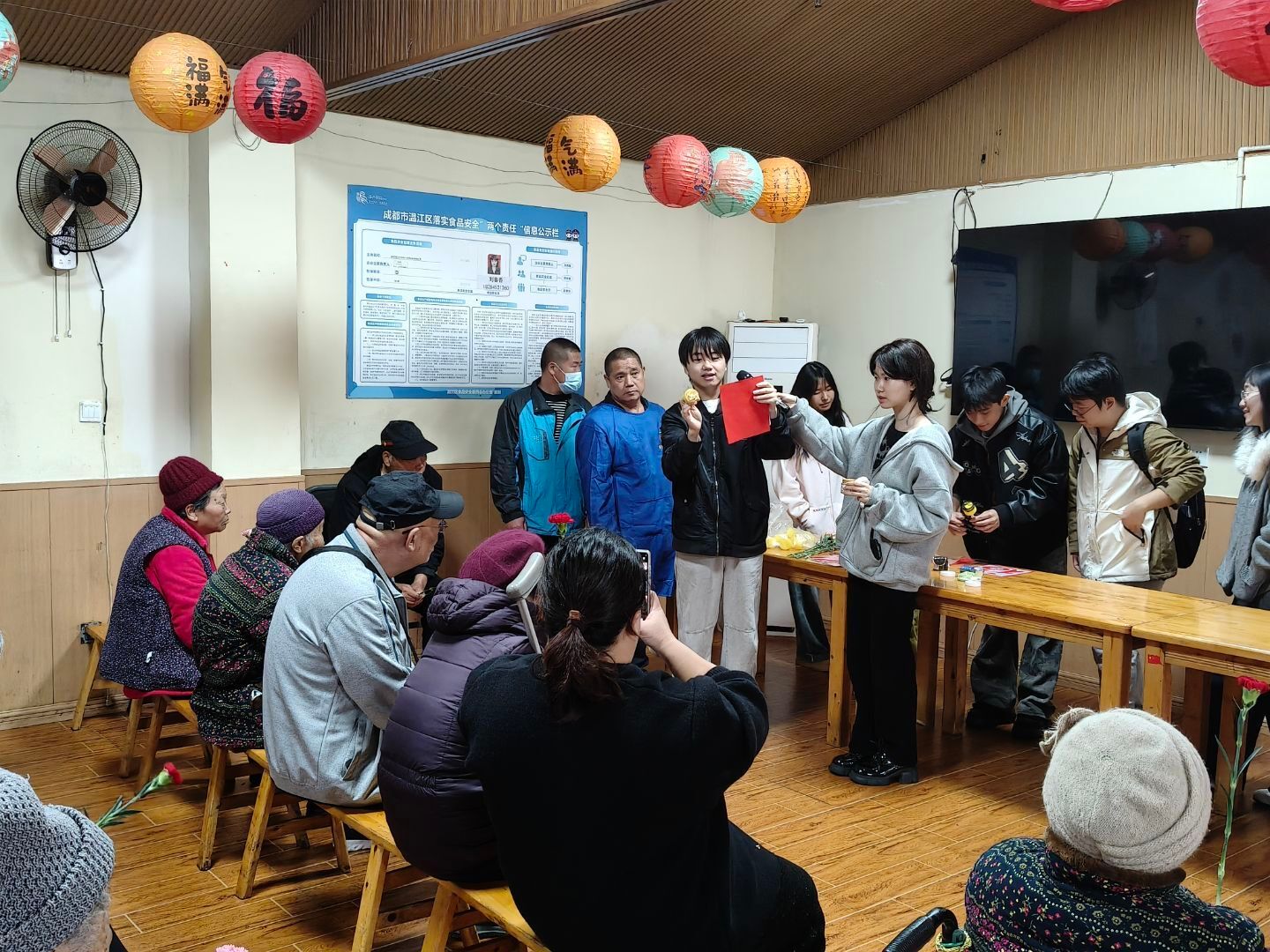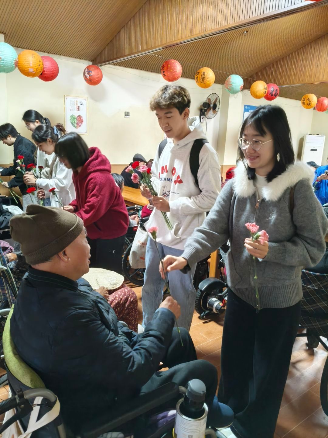 队员们以《我爱你中国》《如愿》《小美满》三首歌曲拉开序幕。旋律回荡之间,不少老人含笑跟唱,眼中闪烁着回忆与感动。随后,同学们为每一位老人送上鲜花,以芬芳传递敬意,以问候温暖心扉。