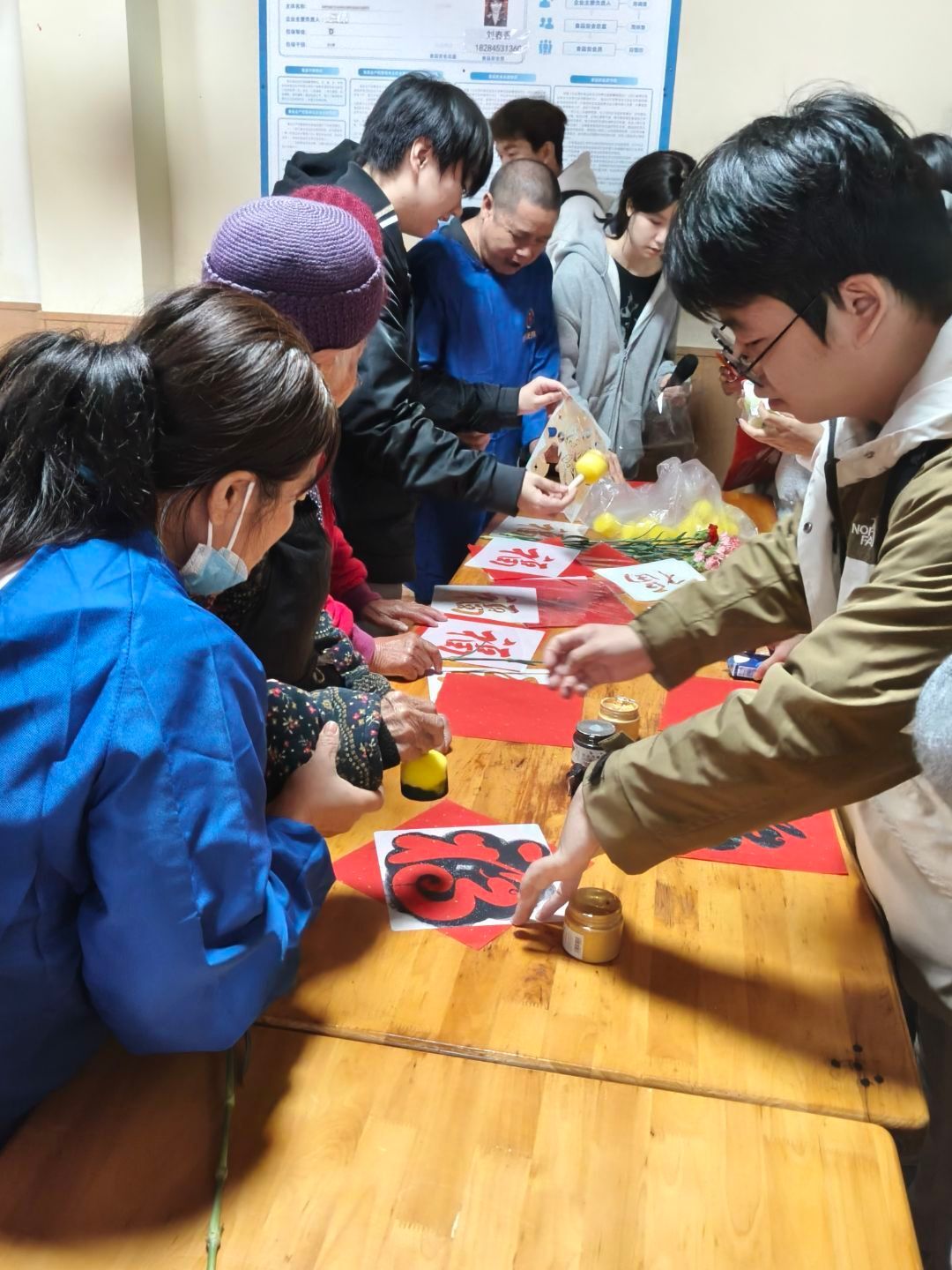 “非遗拓印福字”环节将气氛推向高潮。老人们纷纷踊跃参与,在队员们的耐心协助下,亲手拓印出一幅幅寓意吉祥的“福”字。指尖传递的不仅是技艺,更是两代人之间无声的默契与陪伴。
